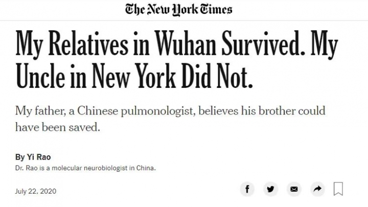 In der Kommentarspalte von „The New York Times“ ist am Mittwoch der Beitrag „Meine Verwandten in Wuhan haben überlebt, aber mein Onkel in New York ist gestorben“ von Rao Yi veröffentlicht worden...