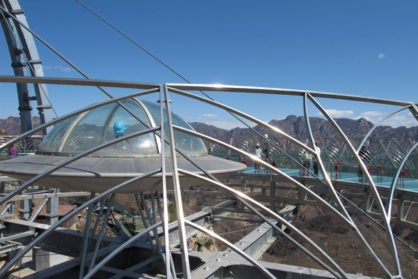 Unter einigen der Plexi- oder Sicherheitsglasplatten sind LED-Matten angebracht, die verschiedene leuchtende Muster erzeugen. Überflüssige technische Spielerei oder vielleicht eine willkommene Ablenkung vom überall präsenten Abgrund? Auf der eigentlich kreisförmigen Plattform thront ein gigantischer Rundbogen. Die etwa 20 Meter breite und 36 separate Glasscheiben enthaltende Konstruktion wird auch von Seilen gehalten. Ein Ausflug zur Shilinxia Scenic Area lohnt sich. Denn wo sonst kann man High-Tech-Architektur, Berge und Außerirdische bewundern?!