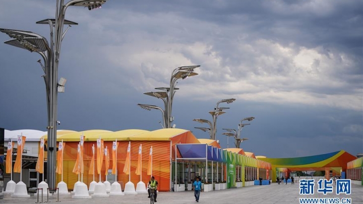 Diese Fotos vom 1. September zeigen das Ausstellungsgelände der Internationalen Messe für Dienstleistungshandel Chinas (CIFTIS) im Olympischen Park in Beijing ...