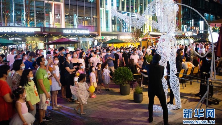 Am Abend des 8. August schauten sich einige Personen verschiedene Straßenaufführungen in der Geschäftszone Wangjing im Beijinger Bezirk Chaoyang an ...