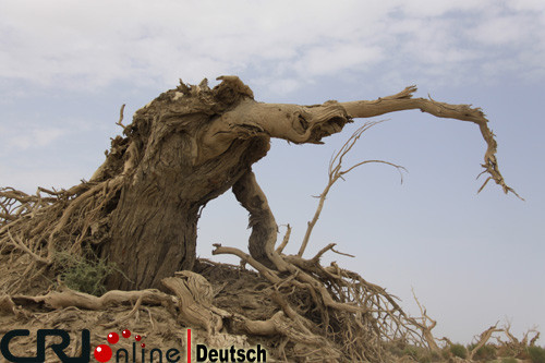 „Die verschiedenblättrige Pappel ist ein „Heldenbaum". Sie kann 1000 Jahre lang leben, nach ihrem Tod noch 1000 Jahre aufrecht stehen und nachdem sie zerbrochen ist, noch 1000 weitere Jahre nicht verfaulen. Wir, die Leute des Produktions- und Aufbaukorps sind genau wie die verschiedenblättrige Pappel. Anfang der 1950er Jahre sind wir im Tarim-Becken eingetroffen. Damals war hier nur Ödland. Wir halfen den Einheimischen bei der Produktion. Dann haben wir ihnen das neue Ackerland überlassen und mit der weiteren Bodenerschließung in der Wüste begonnen."