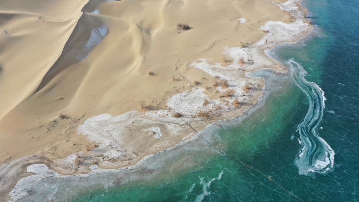 Der Luobu-See im Landkreis Weili in Bayingolin im Uigurischen Autonomen Gebiet Xinjiang ist nun durch die anhaltend tiefen Temperaturen zugefroren. Der grüne Eissee und der goldene Sand der Taklamakan-Wüste bilden zusammen eine malerische Winterlandschaft ...
