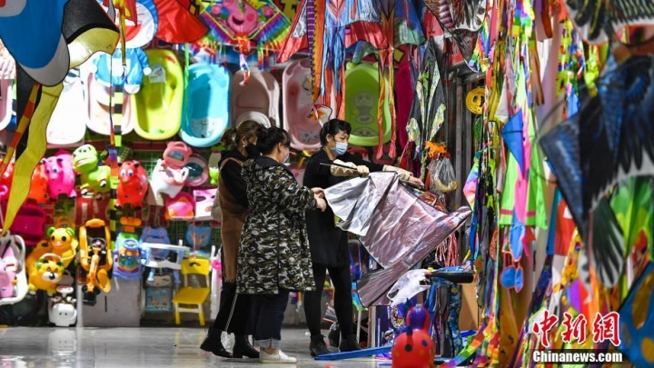 Am 1. April kauften die Leute Flugdrachen im Diwang Internationalen Einkaufszentrum in Urumqi im westchinesischen Uigurischen Autonomen Gebiet Xinjiang ...