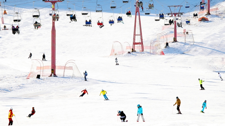 Schon Anfang des Winters ist im Skigebiet des Silk Road International Resorts am Fuße des Nanshan-Bergs in Ürümqi (Uigurisches Autonomes Gebiet Xinjiang) wieder viel los ...
