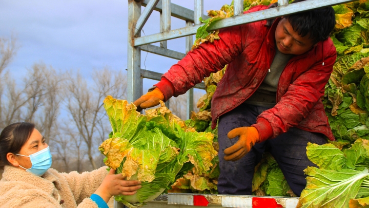 Die Landwirte im Regierungsbezirk Tacheng im Uigurischen Autonomen Gebiet Xinjiang beeilen sich angesichts von schönem Wetter mit der Ernte von Chinakohl